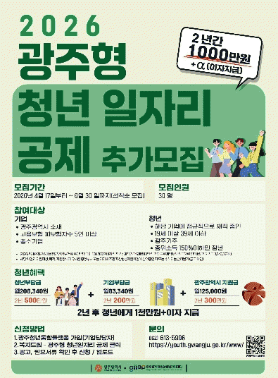 [ÅåÅå´º½º]±¤ÁÖ±¤¿ª½Ã´Â Áö¿ª û³âÀÇ ÀÚ»ê Çü¼º°ú Àå±â±Ù¼ÓÀ» Áö¿øÇϱâ À§ÇÑ ¡®±¤ÁÖÇü û³â ÀÏÀÚ¸® °øÁ¦»ç¾÷¡¯ Âü¿©ÀÚ 30¸íÀ» 4¿ù17ÀϺÎÅÍ 6¿ù30ÀϱîÁö Ãß°¡ ¸ðÁýÇÑ´Ù.