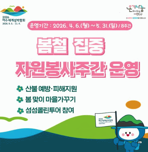[ÅåÅå´º½º]¿©¼ö½Ã´Â 4¿ù 6ÀϺÎÅÍ 5¿ù 31ÀϱîÁö 8ÁÖ°£ ¡®º½Ã¶ ÁýÁß ÀÚ¿øºÀ»çÁÖ°£¡¯À» ¿î¿µÇÏ°í ¿Â±â³ª´® Ä·ÆäÀÎÀ» ÃßÁøÇÑ´Ù°í ¹àÇû´Ù.