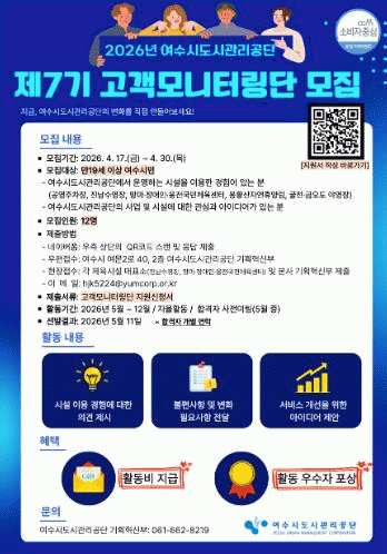 [ÅåÅå´º½º]¿©¼ö½Ãµµ½Ã°ü¸®°ø´ÜÀº ½Ã¹Î Âü¿©¸¦ ±â¹ÝÀ¸·Î °ø´Ü ½Ã¼³°ú ¼ºñ½º ǰÁúÀ» Á¡°ËÇÏ°í °³¼±Çϱâ À§ÇÑ '2026³â Á¦7±â °í°´¸ð´ÏÅ͸µ´Ü'À» ¸ðÁýÇÑ´Ù°í ¹àÇû´Ù.