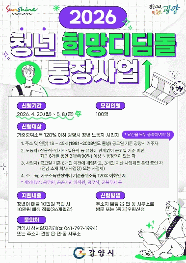 [ÅåÅå´º½º]±¤¾ç½Ã´Â Àü¶ó³²µµ¿Í ÇÔ²² û³âÀÇ ÀÚ»ê Çü¼º°ú ¹Ì·¡ Áغñ¸¦ Áö¿øÇϱâ À§ÇØ ¡®2026³â û³â Èñ¸Áµðµõµ¹ ÅëÀå»ç¾÷¡¯ Âü¿©ÀÚ¸¦ ¸ðÁýÇÑ´Ù°í ¹àÇû´Ù.