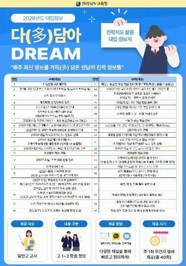[ÅåÅå´º½º] Àü¶ó³²µµ±³À°Ã»ÀÌ ±Þº¯ÇÏ´Â ´ëÀÔ È¯°æ¿¡ ¼±Á¦ÀûÀ¸·Î ´ëÀÀÇϰí Çб³ ÇöÀåÀÇ ÁøÇÐÁöµµ ¿ª·®À» °ÈÇϱâ À§ÇØ ¸ÂÃãÇü ´ëÀÔ Á¤º¸Áö ¡®´Ù(Òý)´ã¾Æ DREAM¡¯À» ¹ß°£¡¤¿î¿µÇÑ´Ù.
