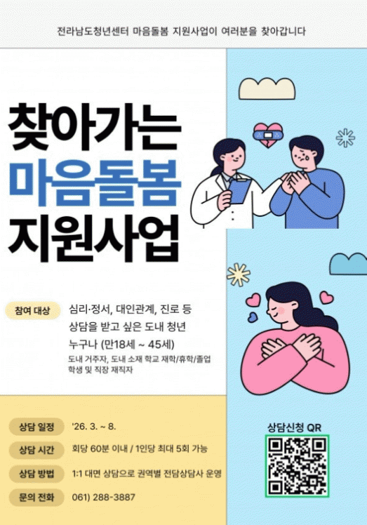 [ÅåÅå´º½º] Àü¶ó³²µµ°¡ Áö¿ª û³âÀÇ ½É¸®Àû¡¤Á¤¼Àû ¾ÈÁ¤°ú °Ç°ÇÑ »çȸÂü¿©¸¦ Áö¿øÇϱâ À§ÇØ ¡®2026³â û³â ¸¶À½Ä¡À¯ ÇÁ·Î±×·¥¡¯À» ½Ã¹ü ÃßÁøÇÑ´Ù.