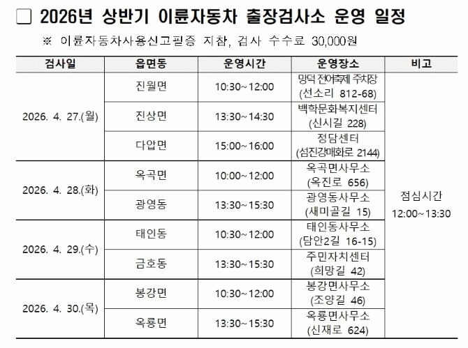[ÅåÅå´º½º]±¤¾ç½Ã´Â ÀÌ·ûÀÚµ¿Â÷ Á¤±â°Ë»çÀÇ ¿øÈ°ÇÑ ÃßÁø°ú °Ë»ç¼Ò°¡ ¾ø´Â Áö¿ª ÁÖ¹ÎÀÇ ÆíÀǸ¦ À§ÇØ 4¿ù 27ÀϺÎÅÍ 30ÀϱîÁö Çѱ¹±³Åë¾ÈÀü°ø´Ü°ú ÇÕµ¿À¸·Î 2026³â »ó¹Ý±â ÀÌ·ûÀÚµ¿Â÷ ÃâÀå°Ë»ç¼Ò¸¦ ¿î¿µÇÑ´Ù°í ¹àÇû´Ù.