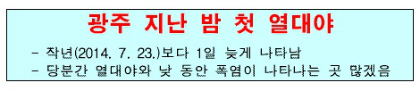 ±¤ÁÖ±â»óû °ü°èÀÚ´Â "Àü³¯ ³· µ¿¾È °í¿Â´Ù½ÀÇÑ ³²¼·ù°¡ À¯ÀÔµÇ¸é¼ ´õ¿öÁø °ø±â°¡ ¹ã »çÀÌ È帮°í ¹Ù¶÷ÀÌ ¾àÇØ ´ë±â°¡ ³Ã°¢µÇÁö ¾Ê¾Æ ÃÖÀú±â¿ÂÀÌ 25µµ ÀÌ»óÀ» À¯ÁöÇÏ¸é¼ ¿´ë¾ß°¡ ¹ß»ýÇÑ °Í °°´Ù"°í ¸»Çß´Ù.