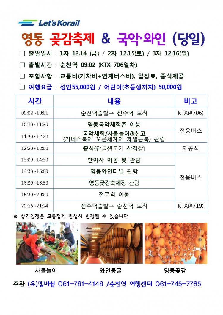¿µµ¿ °ù°¨ÃàÁ¦ & ±¹¾Ç¡¤¿ÍÀÎ ±âÂ÷¿©ÇàÀº ´çÀÏ ÀÏÁ¤À¸·Î ¼øÃµ¿ªÀ» 09½Ã02ºÐ¿¡ Ãâ¹ßÇÏ¿© ¿µµ¿ ±¹¾ÇüÇèÃÌ, ¹Ý¾ß»ç °ü¶÷, ¿µµ¿ ¿ÍÀÎÅͳΠµî °ü±¤ ÈÄ 21½Ã 24ºÐ°æ ±¤¾ç¿ª¿¡ µÇµ¹¾Æ¿À´Â ÀÏÁ¤À¸·Î, ¿©Ç๮ÀÇ ¹× ¿¹¾àÀº ¼øÃµ¿ª ¿©Ç༾ÅÍ(061-745-7785)¿Í ¸â¹ö½± Åõ¾î ¿©Çà»ç(061-761-4146)¿¡¼ ¾È³»¸¦ ¹ÞÀ» ¼ö ÀÖ´Ù.