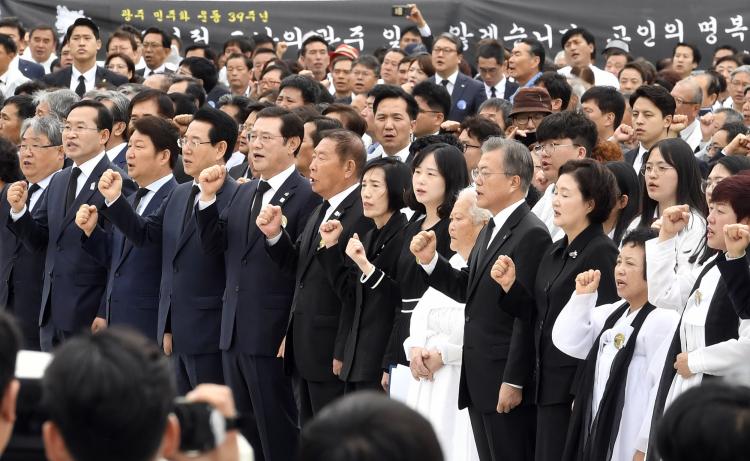 [ÅåÅå´º½º]Á¦39ÁÖ³â 5¡¤18¹ÎÁÖȿ ±â³ä½ÄÀÌ 18ÀÏ ¿ÀÀü ºÏ±¸ ¿îÁ¤µ¿ ±¹¸³ 5¡¤18¹ÎÁÖ¹¦Áö¿¡¼ ¿·Á ¹®ÀçÀÎ ´ëÅë·É°ú ±èÁ¤¼÷ ¿©»ç¸¦ ºñ·Ô, À̿뼷 ±¤ÁÖ±¤¿ª½ÃÀå, ¿©¡¤¾ß ÁöµµºÎ, °¢´ç Á¤Ä¡ÀÎ, 5¡¤18À¯°¡Á·, 5¿ù ´Üü ȸ¿ø, ½Ã¹Î µî Âü¼®ÀÚµéÀÌ ¼ÕÀ» Àâ°í 'ÀÓÀ» À§ÇÑ ÇàÁø°î'À» Á¦Ã¢Çϰí ÀÖ´Ù./±¤ÁÖ±¤¿ª½Ã Á¦°ø