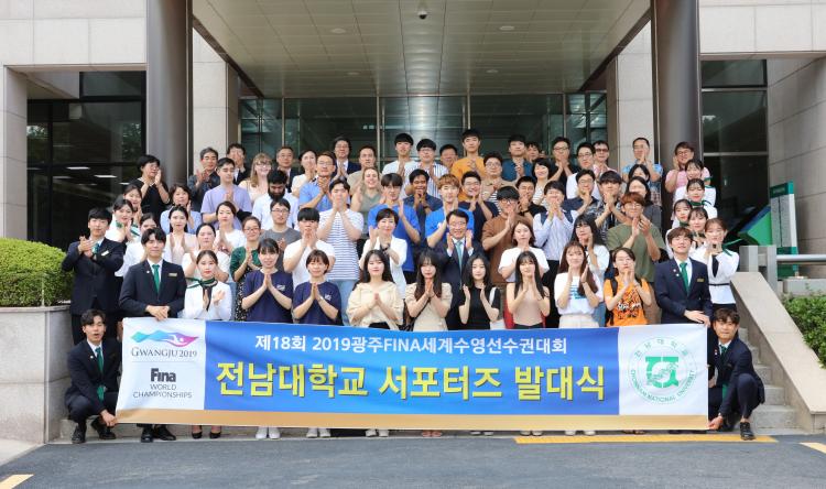 Àü³²´ë´Â À̳¯ ¿ÀÈÄ ´ëÇк»ºÎ Çö°ü¿¡¼ Á¤º´¼® ÃÑÀåÀ» ºñ·ÔÇÑ Çг» º¸Á÷±³¼ö¿Í Á÷¿ø, ¿Ü±¹ÀÎ À¯Çлý, ÇлýÈ«º¸´ë»ç, ´ëȸ ÀÚ¿øºÀ»çÇлý µî 1¹é¿©¸íÀÌ Âü¼®ÇÑ °¡¿îµ¥, Á¦18ȸ 2019±¤ÁÖ FINA¼¼°è¼ö¿µ¼±¼ö±Ç´ëȸ ¼Æ÷ÅÍÁî ¹ß´ë½ÄÀ» °®°í, ´ëȸ±â°£µ¿¾È ¼ö¿µ´ëȸ È«º¸¸¦ ÅëÇÑ ºÕ Á¶¼º°ú °¢±¹ ¼±¼ö´Ü °æ±â °ü¶÷ ¹× ´ÜüÀÀ¿ø µî¿¡ Àû±Ø ³ª¼±â·Î Çß´Ù.