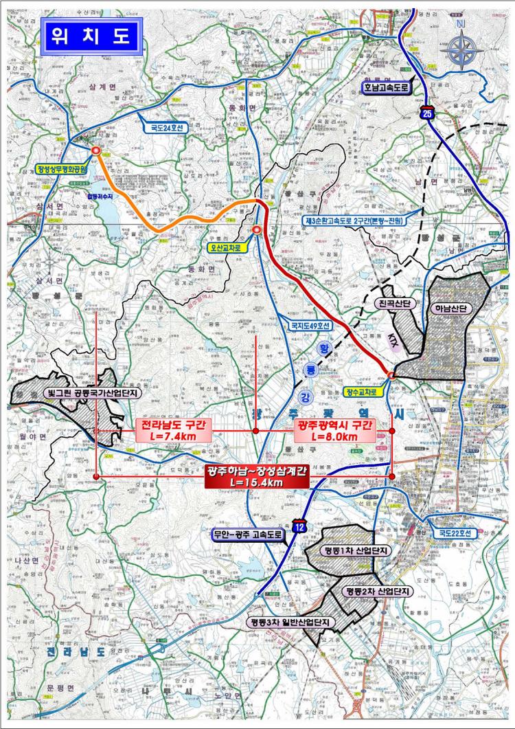 ±¤ÁÖ½Ã¿Í Àü³²µµ´Â ±¤Áֽà ±¤»ê±¸ Àå¼öµ¿ Àå¼ö±³Â÷·Î¿¡¼ °íºÀ·Î(´ë·Î1-19È£¼±) ÀÓ°îÀ» °ÅÃÄ À强±¸°£ Áö¹æµµ 734È£¼±À» µû¶ó ¼ö¾çÀú¼öÁö ¾Õ À强 »ó¹«ÆòȰø¿ø±îÁö 15.4§°(±¤ÁÖ 8§°, Àü³² 7.4§°) ±âÁ¸ 2Â÷·Î¸¦ 4Â÷·Î·Î È®ÀåÇÏ°Ô µÇ¸ç, ÀϺΠ±¸°£¿¡ ´ëÇØ ¼±Çü°³·® ÇÒ °èȹÀÌ´Ù.