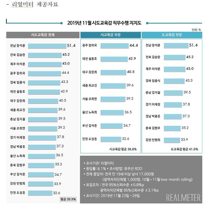 6ÀÏ Àü¶ó³²µµ±³À°Ã»¿¡ µû¸£¸é, Àå¼®¿õ ±³À°°¨Àº ¿©·ÐÁ¶»ç ±â°ü ¸®¾ó¹ÌÅͰ¡ ÃÖ±Ù ½Ç½ÃÇÑ ¹Î¼±3±â Àü±¹ 17°³ ½Ã¡¤µµ±³À°°¨ÀÇ 2019³â 11¿ù Á÷¹«¼öÇà ÁöÁöµµ Á¶»ç¿¡¼ 51.4%ÀÇ ÁöÁöÀ²À» ¾ò¾ú´Ù.