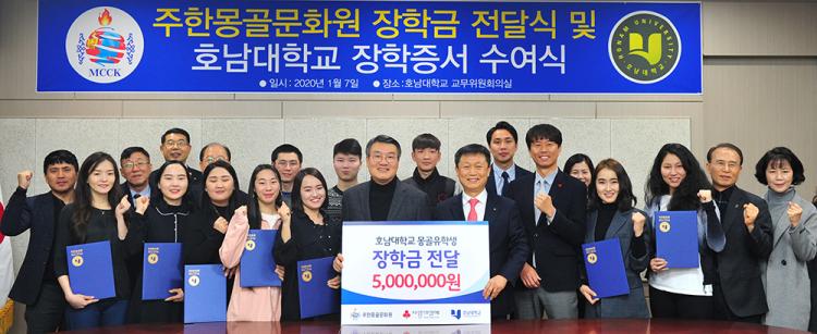 ¹Ú»óö È£³²´ëÇб³ ÃÑÀå°ú ±è¸í±º ±ÝÈ£ÁÖÅà ´ëÇ¥ÀÌ»ç´Â 1¿ù 7ÀÏ ¿ÀÀü 11½Ã È£³²´ëÇб³ ´ëÇк»ºÎ ±³¹«À§¿øÈ¸½Ç¿¡¼ Çкλý 5¸í, Çѱ¹¾î±³À°¿ø ÀçÇлý 5¸í µî ÃÑ 10¸íÀÇ ¸ù°ñ À¯Çлý¿¡°Ô ÀåÇÐÁõ¼¿Í ÇÔ²² ÀåÇÐ±Ý 50¸¸¿ø¾¿À» Àü´ÞÇß´Ù.