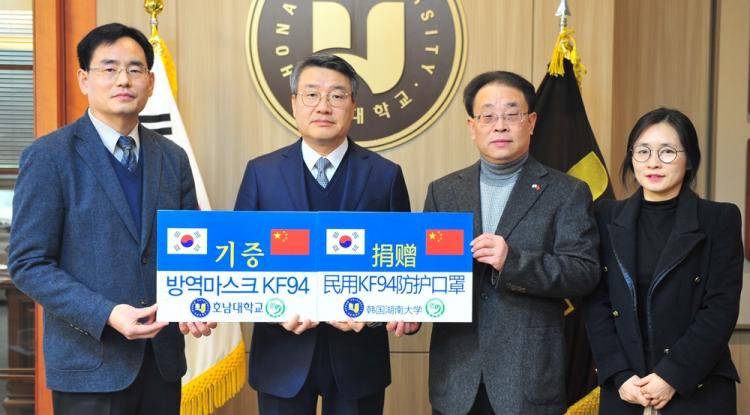 ¹Ú»óö È£³²´ëÇб³ ÃÑÀåÀº Áö³ 1¿ù 29ÀÏ ÃÑÀå½Ç¿¡¼ È£³²´ëÇб³ °øÀÚ¾ÆÄ«µ¥¹Ì ÀÌÁ¤¸² ¿øÀå°ú Á±ǹ®(Áß±¹ Èij´ëÇÐ ±³¼ö) Áß¹æ¿øÀå¿¡°Ô Áß±¹ ±³À°ºÎ ±¹°¡ÇÑÆÇ(ÏÐÊ«ùÓ÷ý)°ú Èĺ£ÀÌ(ûÉÝÁ)¼º ¿ìÇÑ(ÙëùÓ)½Ã, Èij(ûÉÑõ)¼º Èij´ëÇп¡ ÀüÇØ ´Þ¶ó¸ç KF94 ¹æ¿ª¸¶½ºÅ© 1¸¸°³¸¦ Àü´ÞÇÑ ¹Ù ÀÖ´Ù.