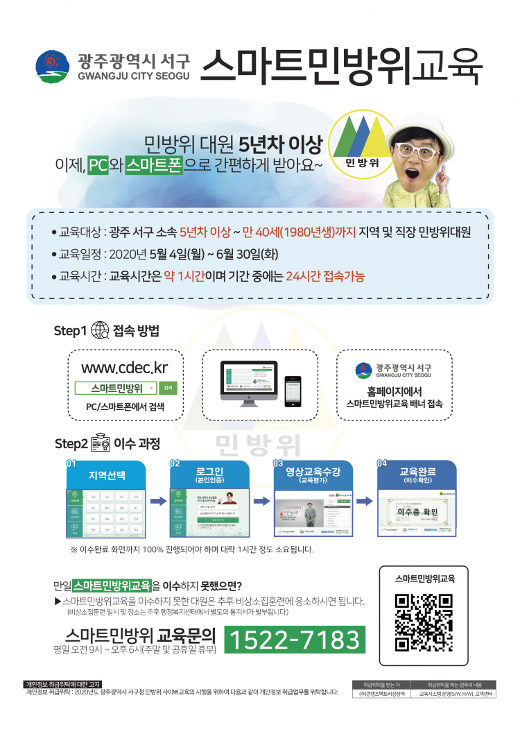±³À°¹æ¹ýÀº ¼±¸Ã» ȨÆäÀÌÁö ¶Ç´Â ÀÎÅÍ³Ý Æ÷Åп¡¼ ½º¸¶Æ®¹Î¹æÀ§±³À° »çÀÌÆ®(www.cdec.kr)¿¡ Á¢¼ÓÇÑ µÚ º»ÀÎÀÎÁõÀ» °ÅÃÄ ÁøÇàÇÏ¸é µÇ¸ç, ±³À° ´ë»óÀÚ¿¡ ´ëÇØ¼´Â ¸ð¹ÙÀÏÀ» ÅëÇØ ±³À°ÀÏÁ¤ īī¿À ¾Ë¸²Åå ¼ºñ½ºµµ ½ÃÇàµÈ´Ù.