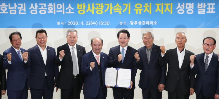 È£³²±Ç(±¤ÁÖ¤ýÀüºÏ¤ýÀü³²) 9°³ »ó°øÈ¸ÀÇ¼Ò È¸Àå´ÜÀº 22ÀÏ ±¤Áֽà ¼±¸ ³ó¼ºµ¿ ±¤ÁÖ»ó°øÈ¸ÀǼҿ¡¼ 4¼¼´ë ¿øÇü ¹æ»ç±¤°¡¼Ó±â È£³²±Ç À¯Ä¡¸¦ Àû±Ø ÁöÁöÇÏ´Â ¼º¸í¼¸¦ ¹ßÇ¥Çϰí ÀÖ´Ù. (¿ÞÂʺÎÅÍ) Àü³²¼øÃµ»ó°øÈ¸ÀÇ¼Ò ±èÁ¾¿í ȸÀå, Àü³²±¤¾ç»ó°øÈ¸ÀÇ¼Ò À̹鱸 ȸÀå, Àü³²¸ñÆ÷»ó°øÈ¸ÀÇ¼Ò ÀÌÇÑö ȸÀå, ±¤ÁÖ»ó°øÈ¸ÀÇ¼Ò Á¤Ã¢¼± ȸÀå, ±è¿µ·Ï Àü¶ó³²µµÁö»ç, ÀüºÏ¼³²»ó°øÈ¸ÀÇ¼Ò ±èÀû¿ì ȸÀå, Àü³²¿©¼ö»ó°øÈ¸ÀÇ¼Ò ¹Ú¿ëÇÏ È¸Àå, ÀüºÏ±º»ê»ó°øÈ¸ÀÇ¼Ò Á¶°æ¼ö »ç¹«±¹Àå.