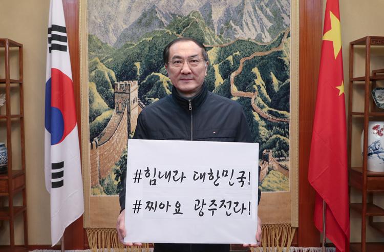 ¾§½Ã¿£À§ Áß±¹ ÁÖ±¤ÁÖÃÑ¿µ»ç´Â À̳¯ Áß±¹ ÁÖ±¤ÁÖÃÑ¿µ»ç°ü Á¢°ß½Ç¿¡¼ ¡®#Èû³»¶ó ´ëÇѹα¹ #Âî¾Æ¿ä ±¤ÁÖÀü¶ó¡¯¶ó°í ÀûÀº ÇÇÄÏÀ» µé°í »çÁøÀ» Âï¾î È£³²´ëÇб³ °ø½Ä ºí·Î±×¿Í ÆäÀ̽ººÏ µî¿¡ ¿Ã·È´Ù.