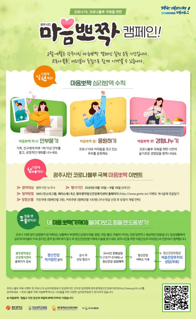 ±¤Áֽô ¡®¸¶À½»Ç¦¡¯ ½Çõ Ä·ÆäÀο¡ ´ëÇÑ ½Ã¹ÎµéÀÇ Àû±ØÀûÀÎ Âü¿©¸¦ À¯µµÇϱâ À§ÇØ ¿À´Â 9¿ù18ÀϱîÁö ¿Â¶óÀÎ À̺¥Æ®µµ ½Ç½ÃÇÑ´Ù. À̺¥Æ® Âü¿©´Â ±¤ÁÖ±¤¿ªÁ¤½Å°Ç°º¹Áö¼¾ÅÍ È¨ÆäÀÌÁö³ª ¼Ò¼È³×Æ®¿öÅ©½Ã½ºÅÛ(SNS¡¤ÀνºÅ¸±×·¥, ÆäÀ̽ººÏ)¿¡ ¡®¸¶À½»Ç¦¡¯ ¼öÄ¢¿¡ ÇØ´çÇÏ´Â ³»¿ëÀ» ´ñ±Û´Þ±âÇÏ¸é µÇ¸ç, Ãß÷À» ÅëÇØ ÃÑ 303¸í¿¡°Ô ¼ÒÁ¤ÀÇ ¸ð¹ÙÀÏ ÄíÆùÀ» Áö±ÞÇÑ´Ù.
