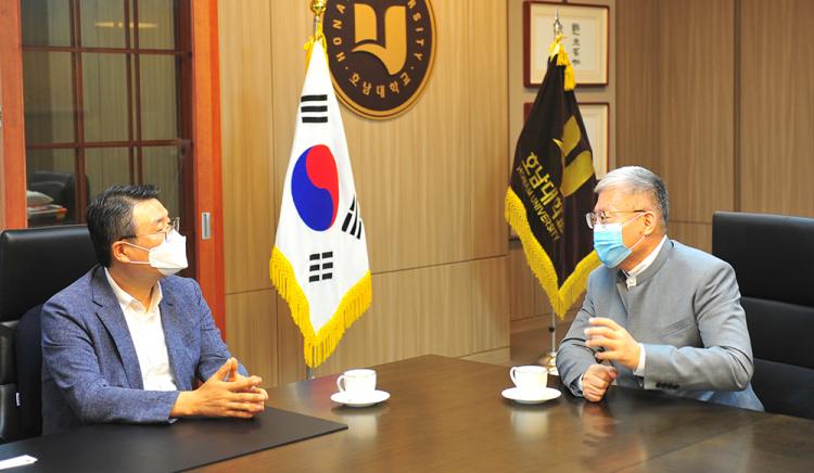 [ÅåÅå´º½º]¹Ú»óö È£³²´ëÇб³ ÃÑÀåÀº 9¿ù 4ÀÏ Àåû°(íåã¯Ë§) ½ÅÀÓ ÁßÈÀιΰøÈ±¹ÁÖ±¤ÁÖÃÑ¿µ»çÀÇ ¿¹¹æÀ» ¹Þ°í ȯ´ãÀ» ³ª´³´Ù.