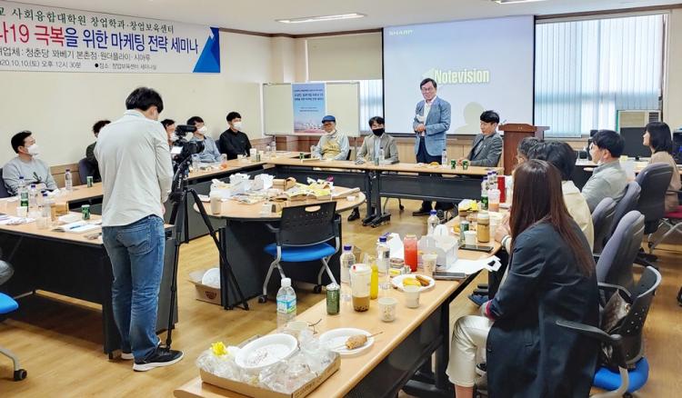 [ÅåÅå´º½º]È£³²´ëÇб³(ÃÑÀå ¹Ú»óö) »çȸÀ¶ÇÕ´ëÇпø â¾÷Çаú¿Í â¾÷º¸À°¼¾ÅÍ´Â 10¿ù 10ÀÏ Ã¢¾÷º¸À°¼¾ÅÍ ¼¼¹Ì³ª½Ç¿¡¼ ¡®¼Ò»óÀÎ Äڷγª19 ±Øº¹À» À§ÇÑ ¸¶ÄÉÆÃÀü·« ¼¼¹Ì³ª¡¯¸¦ °®°í, Äڷγª19·Î °íÀüÇϰí ÀÖ´Â Áö¿ª ³» ¼Ò»óÀÎ Áö¿ø¹æ¾ÈÀ» ³íÀÇÇß´Ù.