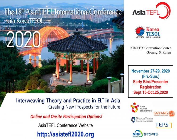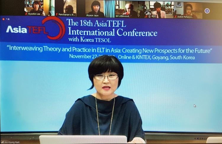 ¿ÃÇØ AsiaTEFL ±¹Á¦Çмú´ëȸ Á¶Á÷À§¿øÀåÀ» ¸Ã°í ÀÖ´Â ¹ÚÁÖ°æ ±³¼ö´Â ±¹Á¦ÇÐȸÀÇ ÁÖ¿ä ÀÓ¿øÁø°ú Çмú´ëȸ ÃÊû¿¬»ç, Á¶Á÷À§¿øµéÀÌ Âü¿©ÇØ À¯Æ©ºê ä³ÎÀ» ÅëÇØ ½Ç½Ã°£ ¹æ¼ÛµÈ À̹ø ȸÀÇ¿¡¼, ¿À´Â 11¿ù 27ÀϺÎÅÍ 29ÀϱîÁö °í¾ç ŲŨ½º ÄÁº¥¼Ç¼¾ÅÍ¿¡¼ ¿Â¿ÀÇÁ¶óÀÎÀ¸·Î ÁøÇàµÇ´Â ¡®Á¦18ȸ AsiaTEFL ±¹Á¦Çмú´ëȸ¡¯ÀÇ Æ¯¼º°ú Á߿伺À» ³Î¸® ¾Ë¸®°í ½ÃûÀÚµéÀÇ ¸¹Àº Âü°¡¸¦ ¿äûÇß´Ù. À̹ø ÅäÅ©¼î´Â ¡®AsiaTEFL 2020¡¯¿¡¼ º¼ ¼ö ÀÖ´Ù.