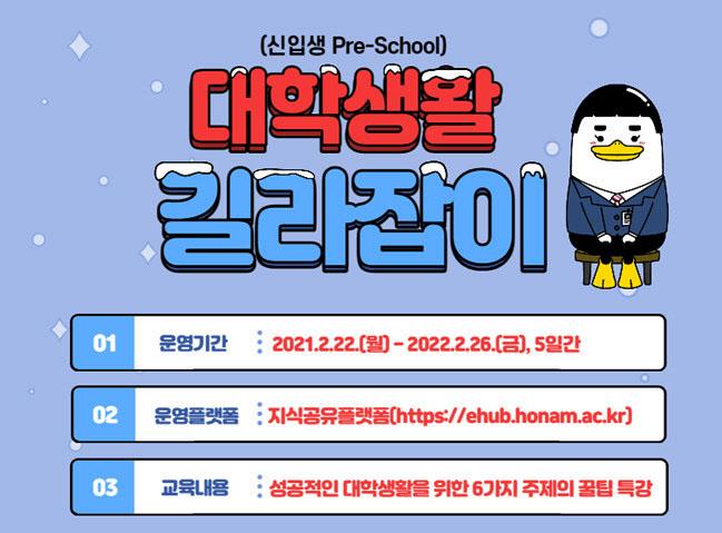 È£³²´ëÇб³ ±³¼öÇнÀ°³¹ß¿ø(¿øÀå ÀåÀ±°æ)Àº 2¿ù 22ÀϺÎÅÍ 5Àϰ£ 2021Çг⵵ ½ÅÀÔ»ýµéÀÇ ÀÚ±âÁÖµµ Çо÷¿ª·® ÇÔ¾çÀ» À§ÇÑ ¿Â¶óÀÎ Pre-ShcoolÀ» ¿î¿µÇÑ´Ù.