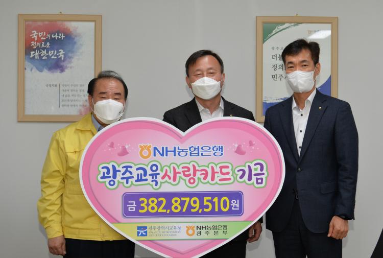 Àü´Þ½Ä¿¡¼ ½Ã±³À°Ã»Àº NH³óÇùÀºÇà ±¤ÁÖÁö¿ªº»ºÎÀå(°Çü±¸)À¸·ÎºÎÅÍ ±¤ÁÖ±³À°»ç¶ûÄ«µå »ç¿ëÀ¸·Î ¹ß»ýÇÑ Àû¸³±Ý 3¾ï8,287¸¸ ¿øÀ» Àü´Þ ¹Þ¾Ò´Ù. ÇØ´ç Àû¸³±ÝÀº Áö³ ÇÑ ÇØ µ¿¾È ½Ã±³À°Ã»¡¤±³À°ÇàÁ¤±â°ü¡¤°¢±ÞÇб³°¡ »ç¿ëÇÑ ¹ýÀÎÄ«µå ÀÌ¿ë ±Ý¾× ¹× ÀÚ¹ßÀûÀ¸·Î Âü¿©ÇÑ ±³Á÷¿øµéÀÌ »ç¿ëÇÑ Ä«µå ÀÌ¿ë ±Ý¾×¿¡¼ ÀÏÁ¤ ºñÀ²À» Àû¸³ÇÑ ±Ý¾×ÀÌ´Ù.