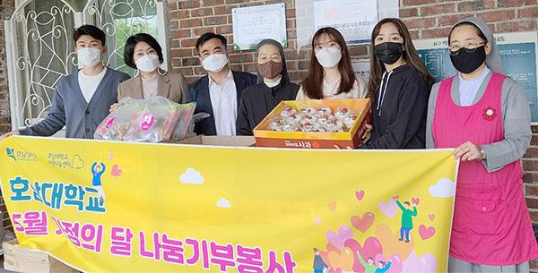 È£³²´ëÇб³ »ç¶û³ª´®¼¾ÅÍ(¼¾ÅÍÀå Áø°æ¹Ì)´Â ¾î¸°À̳¯À» ÇÏ·ç ¾ÕµÐ 5¿ù 4ÀÏ ½Å¾Ö¿ø(¿øÀå ±è¿ä¼Á)°ú ¹é¼± ¹Ù¿À·ÎÀÇ Áý(¿øÀå ÃÖº¹³² ¿¡µ÷´Ù), ¿ëÁøÀ°¾Æ¿ø(¿øÀå ¹ÎÀç¿õ)À» Â÷·Ê·Î ¹æ¹®ÇØ »çȸºÀ»çµ¿¾Æ¸®(È£½ÄÀÌ, »§Å¸Áö¾Æ) Çлýµé°ú Á¶¸®°úÇаú ÃÖ»óÈ£ ±³¼ö µî ´ëÇÐ ±¸¼º¿ø 20¿©¸íÀÌ ÇÔ²² ¸¸µç ÄÉÀͰú °úÀÚ, À§¹®Ç°À» °Ç³Þ´Ù.