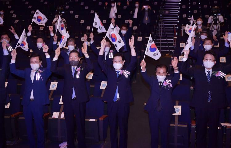 [ÅåÅå´º½º]À̿뼷 ±¤ÁÖ±¤¿ª½ÃÀåÀÌ 15ÀÏ ¿ÀÀü ½Ãû ´ëȸÀǽǿ¡¼ ¿¸° Á¦76Áֳ⠱¤º¹Àý °æÃà½Ä¿¡ Âü¼®ÇØ °æÃà»ç¸¦ Çϰí À¯°øÀÚ Ç¥Ã¢À» Çϰí ÀÖ´Ù./±¤ÁÖ±¤¿ª½Ã Á¦°ø