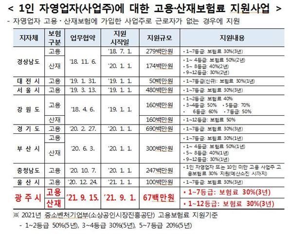 À̹ø Çù¾àÀ» ÅëÇØ ±¤ÁÖ±¤¿ª½Ã´Â ±¤ÁÖ ³» ³ëµ¿ÀÚ¸¦ »ç¿ëÇÏÁö ¾Ê´Â 1ÀÎ ÀÚ¿µ¾÷ÀÚ Áß °í¿ë․»êÀ纸Çè¿¡ °¡ÀÔÇÑ »ç¾÷ÁÖ¿¡°Ô º¸Çè·áÀÇ 30%¸¦ ¿ÃÇØ ¸»±îÁö Áö¿øÇÑ´Ù. ±¤ÁÖ±¤¿ª½Ã´Â Á¦14Â÷ ¹Î»ý¾ÈÁ¤´ëÃ¥ÀÇ ÀÏȯÀ¸·Î Áö¿øÀ» °áÁ¤ÇßÀ¸¸ç, ³»³âºÎÅÍ ÃÖ´ë 3³â°£ Ãß°¡ Áö¿øÇϱâ À§ÇØ °ËÅä Áß¿¡ ÀÖ´Ù.