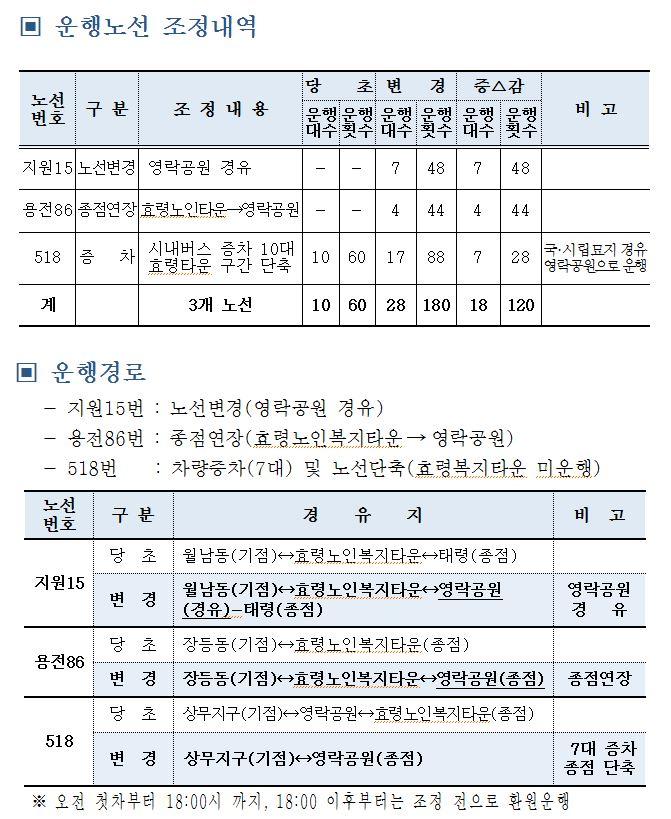 ¼³ ¸íÀý Àü³¯ÀÎ 31ÀϺÎÅÍ´Â ±Í¼º°´°ú ¼º¹¦°´ÀÌ ¸ô¸®´Â »ó¹«Áö±¸~±¤ÁÖÁ¾ÇÕ¹ö½ºÅ͹̳Î~¿µ¶ô°ø¿øÀ» ¿îÇàÇÏ´Â ¡®518¹ø¡¯ ½Ã³»¹ö½º¸¦ 1ÀÏ 28ȸ ÁõÂ÷ÇØ ¿îÇàÇϰí, È¿·É³ëÀκ¹ÁöŸ¿î~¿ù³²µ¿À» ¿îÇàÇÏ´Â ¡®Áö¿ø15¹ø¡¯Àº ¿µ¶ô°ø¿øÀ» °æÀ¯ÇØ ¿îÇàÇÑ´Ù. È¿·É³ëÀκ¹ÁöŸ¿îÀÌ Á¾Á¡ÀÎ ¡®¿ëÀü86¹ø¡¯Àº ¿µ¶ô°ø¿ø±îÁö ¿¬Àå ¿îÇàÇÏ´Â µî ½Ã³»¹ö½º ³ë¼±À» Á¶Á¤ÇØ ¼º¹¦°´ÀÇ À̵¿À» Áö¿øÇÒ ¿¹Á¤ÀÌ´Ù.