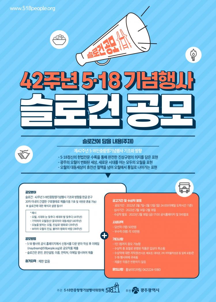 [ÅåÅå´º½º]±¤ÁÖ±¤¿ª½Ã´Â 5‧18¹ÎÁßÇ×Àï±â³äÇà»çÀ§¿øÈ¸(ÀÌÇÏ ¡®5‧18Çà»çÀ§¡¯)°¡ 8ÀϺÎÅÍ 28ÀϱîÁö 42Áֳ⠱â³äÇà»ç Ç¥¾î(½½·Î°Ç)À» Á¢¼öÇÑ´Ù°í ¹àÇû´Ù.