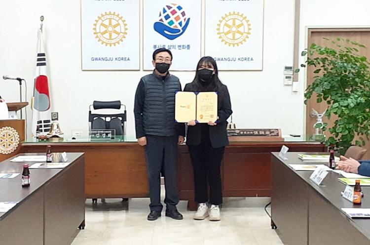 ±¤ÁÖ´ë ȸ°è¼¼¹«Çаú ±è°¡¿¬(¿À¸¥ÂÊ) ÇлýÀÌ Çѱ¹·ÎŸ¸® ÀåÇй®ÈÀç´Ü ÀåÇлýÀ¸·Î ¼±Á¤µÅ ÃÖ±Ù ¼ÛÁ¤Áß¾Ó ·ÎŸ¸®Å¬·´ »ç¹«½Ç¿¡¼ ÀåÇбݰú Áõ¼¸¦ ¹Þ°í ±â³ä ÃÔ¿µÀ» Çϰí ÀÖ´Ù.