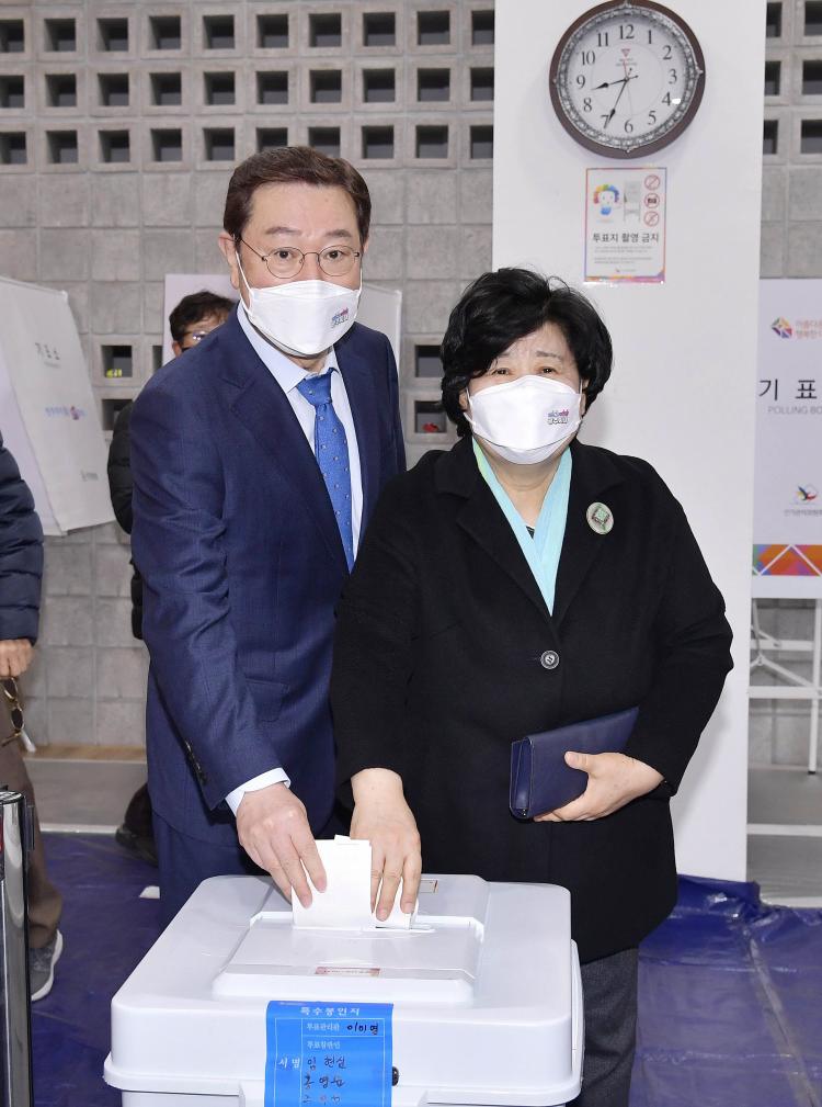 [ÅåÅå´º½º]À̿뼷 ±¤ÁÖ±¤¿ª½ÃÀåÀÌ 4ÀÏ ¿ÀÀü ¼±¸ ±ÝÈ£2µ¿ ¼±¸¹®È¼¾ÅÍ¿¡ ¸¶·ÃµÈ Á¦20´ë ´ëÅë·É¼±°Å »çÀüÅõÇ¥¼Ò¿¡¼ ºÎÀÎ ½Å¿µ¿Á ¿©»ç¿Í ÇÔ²² ÅõÇ¥¸¦ Çϰí ÀÖ´Ù./±¤ÁÖ±¤¿ª½Ã Á¦°ø