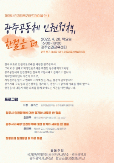 À̹ø ¶ó¿îµåÅ×À̺íÀº ±¹°¡ÀαÇÀ§¿øÈ¸ ±¤ÁÖÀαDZ³À°¼¾ÅÍ¿¡¼ Áý´ãȸ Çü½ÄÀ¸·Î °³ÃÖÇÑ´Ù. ±¤ÁÖ½Ã¿Í ½Ã±³À°Ã»ÀÇ ÀαÇÁ¤Ã¥À» °¢°¢ Æò°¡ÇÏ´Â ¹ßÁ¦¸¦ ÇÑ ÈÄ Âü°¡ÀÚµé °£ ÀÚÀ¯Åä·ÐÀ¸·Î ÁøÇàµÉ ¿¹Á¤ÀÌ´Ù.