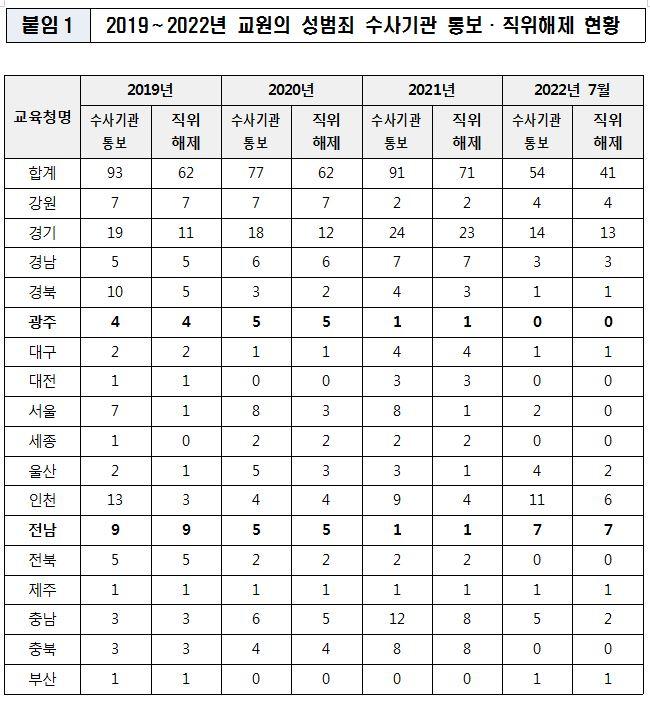 ´õºÒ¾î¹ÎÁÖ´ç ¼µ¿¿ë ÀÇ¿ø(±¹È¸ ±³À°À§¿øÈ¸,¼øÃµ¡¤±¤¾ç¡¤°î¼º¡¤±¸·Ê(À»))¿¡ µû¸£¸é ¿ÃÇØ 7¿ù±îÁö Àü±¹ ÃÊÁßµî ±³¿ø Áß ¼º¹üÁË·Î ¼ö»ç ÁßÀÓÀ» Å뺸¹ÞÀº ±³¿øÀÇ ¼ö´Â ¸ðµÎ 54¸íÀ̾ú´Ù. ÀÌ´Â Äڷγª·Î ÀÎÇØ Á¤»óÀûÀÎ Çлç¿î¿µ°ú »çȸÀû °Å¸®µÎ±â°¡ °ÅµìµÇ¾ú´ø 2020³âÀÇ 62¸í°ú 2021³âÀÇ 91¸íÀÇ Àý¹ÝÀ» ³Ñ¾î¼± ¼öÄ¡´Ù. Äڷγª ¹ß»ý ÀÌÀüÀÎ 2019³â¿¡ ¼º¹üÁË·Î ¼ö»ç Å뺸¸¦ ¹ÞÀº ±³¿øÀº 93¸íÀ̾ú´Ù.