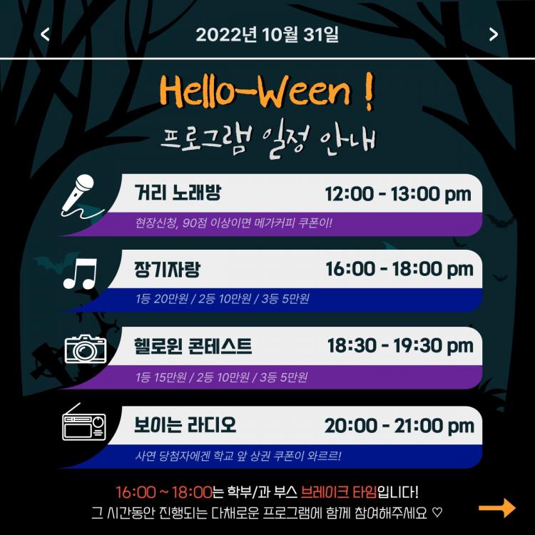 À̳¯ ¿ÀÈÄ 6½Ã 30ºÐºÎÅÍ´Â Áß¾Ó¹«´ë¿¡¼ ÇÒ·ÎÀ© ÄÚ½ºÆ¬À» ÀÚ¶ûÇÏ´Â ÄÜÅ×½ºÆ®¸¦ °³ÃÖÇÑ´Ù. ¿ÀÈÄ 8½Ã¿¡´Â ¡®ÇÒ·ÎÀ© ¹ãÀÇ ²Þ¡¯À» ÁÖÁ¦·Î ¹«¼¿î À̾߱⠵îÀÇ ´Ù¾çÇÑ »ç¿¬À» Á¢¼ö ¹Þ¾Æ ÁøÇàÀÚ°¡ ÀоîÁÖ´Â º¸ÀÌ´Â ¶óµð¿À¸¦ ¼±º¸ÀδÙ. »ç¿¬ ´ç÷ÀÚ¿¡°Ô´Â Áö¿ª »ó±Ç Ȱ¼ºÈ¸¦ À§ÇØ Çб³ ¾Õ »ó±Ç ÄíÆùÀÌ Áö±ÞµÈ´Ù.