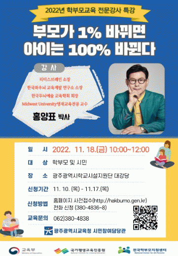[ÅåÅå´º½º]±¤Áֽñ³À°Ã»ÀÌ ¿À´Â 18ÀÏ ¿ÀÀü 10½Ã È«¾çÇ¥ ¹Ú»ç¸¦ ÃÊÃ»ÇØ Çкθð¿Í ½Ã¹ÎÀ» ´ë»óÀ¸·Î ±¤ÁÖÇб³½Ã¼³Áö¿ø´Ü ´ë°´ç¿¡¼ Çкθð±³À° Ư°À» ½Ç½ÃÇÑ´Ù.