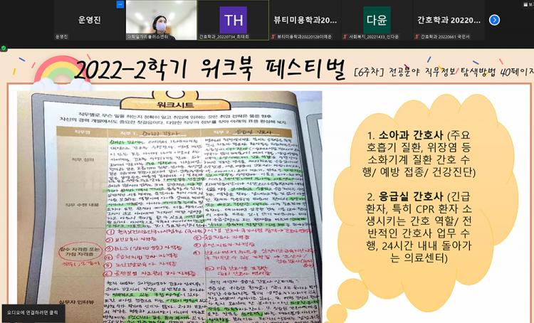 ¿öÅ©ºÏ Æä½ºÆ¼¹úÀº 1Çг⠴ë»ó Áø·Î ±³°ú¸ñÀÎ ¡®ÀμºÇÔ¾ç°ú Áø·ÎŽ»ö¡¯ ¿öÅ©ºÏÀ» Ȱ¿ëÇØ ÀÚ½ÅÀÇ Áø·Î¸¦ Ž»öÇϰí Ãë¾÷¸ñÇ¥¸¦ ¼¼¿ö ¿ì¼ö ÇлýÀ» ½Ã»óÇÏ´Â ´ëȸ·Î ÃÑ 31¸íÀÌ Âü¿©ÇØ °£È£Çаú ÃÖÅÂÈñ Çлý µî 3¸íÀÌ ÃÖ¿ì¼ö»óÀ», ¸¸È¾Ö´Ï¸ÞÀ̼ÇÇаú ±è¹ÎÀç Çлý µî 24¸íÀÌ ¿ì¼ö»óÀ» ¼ö»óÇß´Ù.