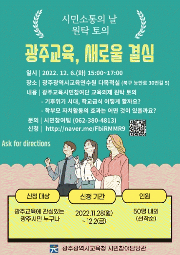 [ÅåÅå´º½º]±¤Áֽñ³À°Ã»ÀÌ ¿À´Â 12¿ù6ÀÏ ±¤ÁÖ±³À°¿¬¼ö¿ø ´Ù¸ñÀû½Ç¿¡¼ ±³À°Çö¾È¿¡ ´ëÇØ ½Ã¹Î°ú ÇÔ²² ¼ÒÅëÇÏ°í °ø°¨´ë¸¦ Çü¼ºÇÏ´Â ½Ã¹Î¼ÒÅëÀÇ ³¯À» °³ÃÖÇÑ´Ù.