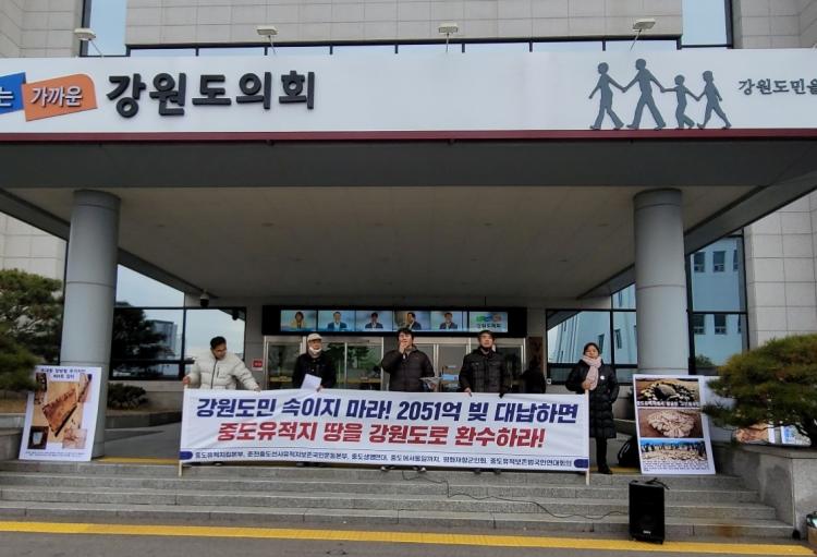 [ÅåÅå´º½º] Ãáõ ÁßµµÀ¯Àû ÁöÅ´À̵é°ú °¢°èÃþ ½Ã¹Î´Üüµé°ú ¶æÀÖ´Â Á¤´çµéÀº 9ÀÏ ¿ÀÀü 8½Ã30ºÐ, °¿øµµÀÇȸ ¾Õ¿¡¼ ¡°°¿øµµ´Â ÁßµµÀ¯ÀûÁö ÅäÁö¸¦ ȯ¼öÇ϶󡱴 ¿äÁöÀÇ ±âÀÚȸ°ßÀ» °¡Á³´Ù.