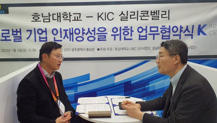 [ÅåÅå´º½º] ¼¼°è ÃÖ´ë IT¡¤°¡Àü¹Ú¶÷ȸÀÎ ¡®CES(Consumer Technology Association) 2023¡¯¿¡ È£³²´ëÇб³ Âü°ü´ÜÀ» À̲ø°í ÀÖ´Â ¹Ú»óö È£³²´ëÇб³ ÃÑÀåÀº 1¿ù 7ÀÏ(Çѱ¹½Ã°£) ¹Ì±¹ ¶ó½ºº£À̰Žº CES Çà»çÀå ³»ÀÇ ±¤ÁÖ °øµ¿ºê·£µå È«º¸°ü¿¡¼ ¹Ì±¹ KIC(Korea Innovation Center Silicon Valley) ±Û·Î¹úÇõ½Å¼¾ÅÍ ¹èÁ¤À¶ ¼¾ÅÍÀå°ú ±Û·Î¹ú ±³·ù Çù·ÂÀ» À§ÇÑ MOU¸¦ ü°áÇß´Ù.
