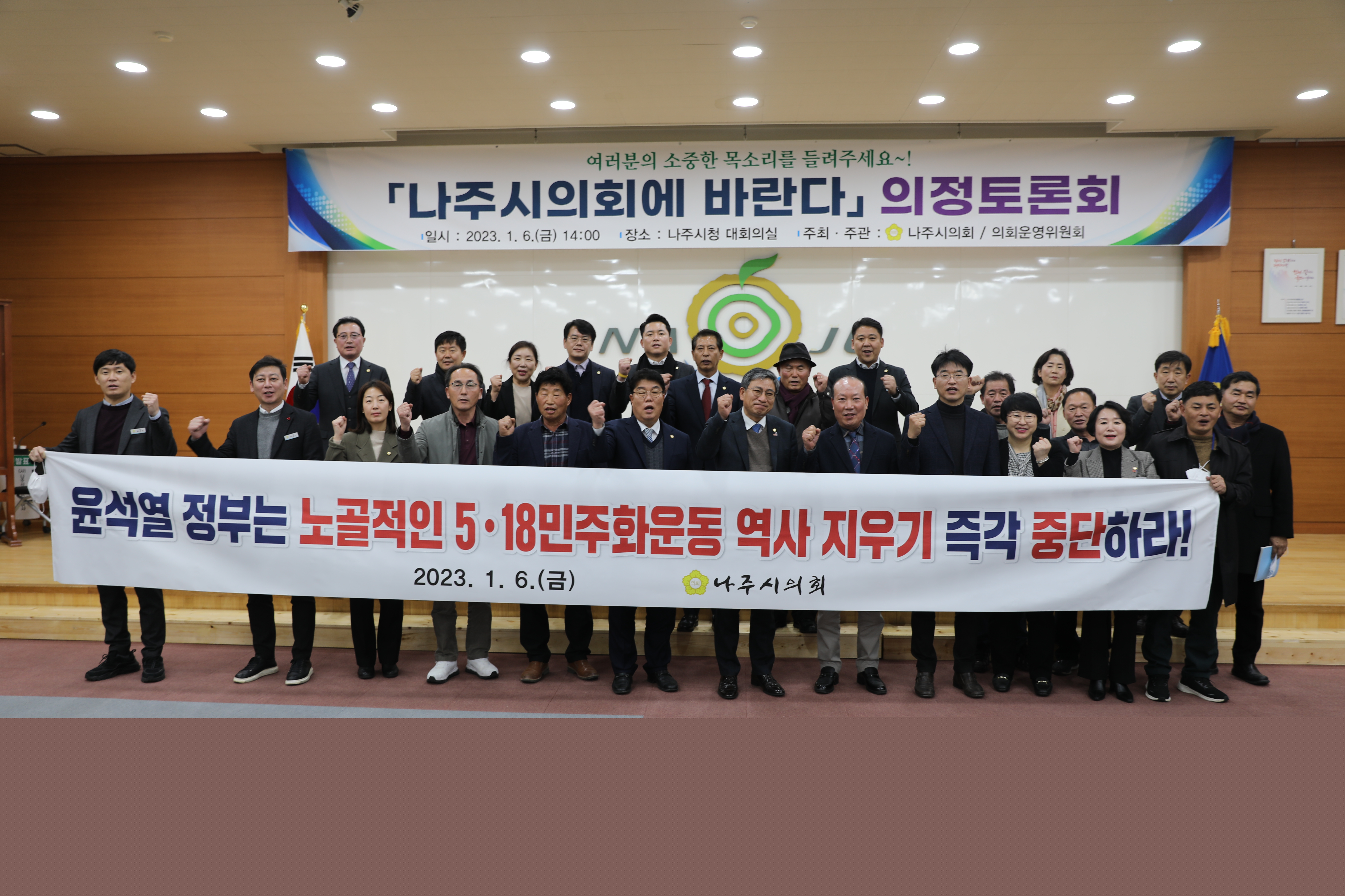 ÇÑÆí ÀÇȸ´Â À̳¯ ¿ÀÀü ±ä±Þ ÀÓ½Ãȸ¸¦ ¿°í ¡¸À±¼®¿ Á¤ºÎÀÇ ³ë°ñÀûÀÎ 5¡¤18¹ÎÁÖȿ ¿ª»ç Áö¿ì±â ±Ô꡹°áÀǾÈÀ» ¸¸ÀåÀÏÄ¡·Î äÅÃÇϰí, Åä·Ðȸ¿¡ Âü¼®ÇÑ ½Ã¹Îµé°ú ÇÔ²² À±¼®¿ Á¤ºÎÀÇ 5.18¹ÎÁÖȿ ¿ª»ç Áö¿ì±â ÇàŸ¦ ±ÔźÇÏ´Â ÀÚ¸®µµ ¸¶·ÃÇß´Ù.